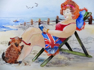 A watercolour painting of a holiday girl on the beach